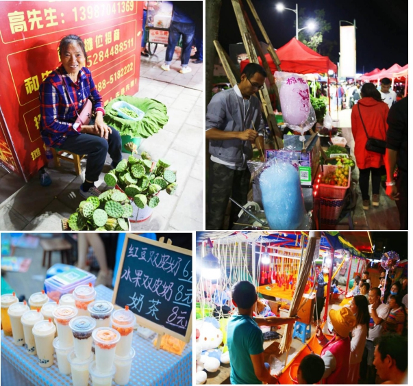 截止目前嘉和地摊市场和夜市摊位已有400多家摊贩进驻,商品种类繁多,有传统的烧烤、小吃、果蔬、服装,也有新颖奇特的手作、饰品、游乐、乐队表演、艺术展览等,五花八门,百花齐放。